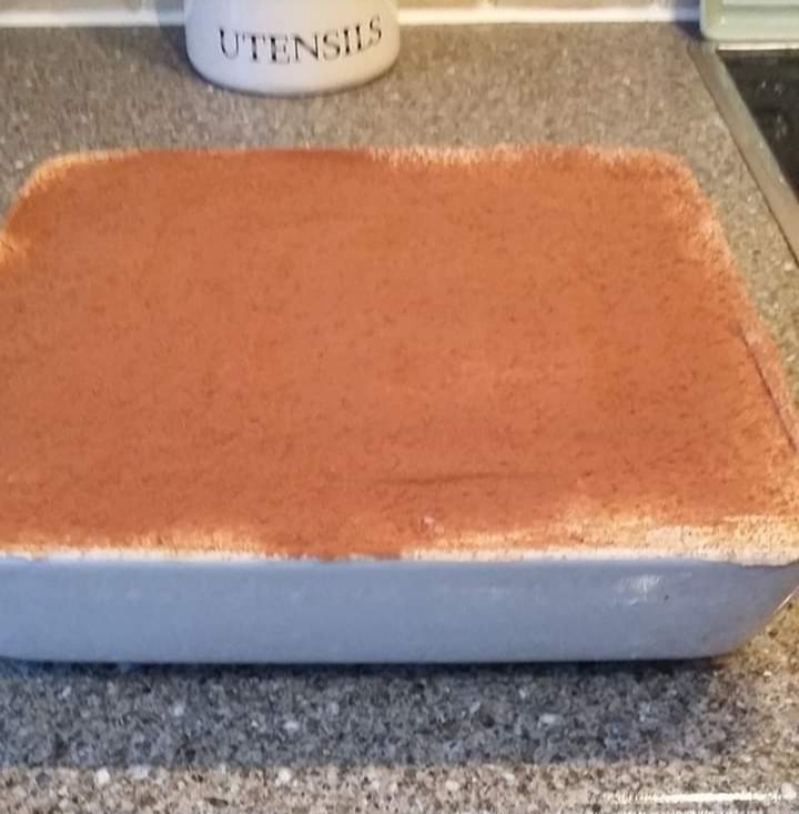 Place remaining sponges on top and pour over remaining coffee mixture then top with the remaining mascarpone mixture and smooth the surface then dust with sieved cocoa powder or hot chocolate or even grate a chocolate bar over the top.