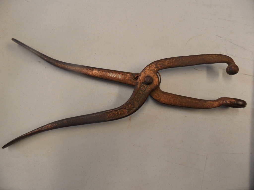 This frightening-looking implement was used in Hilton’s shoe shop in Trowbridge in the mid-twentieth century. It is nearly 40cm long and is made of solid metal, so is very heavy. It is a bunion reliever, which was used to press an indentation into the uppers of a shoe. The metal ball fits inside a metal ring when closed, stretching the leather in order to relieve pressure on the offending bunion, allowing the wearer to walk with greater comfort.