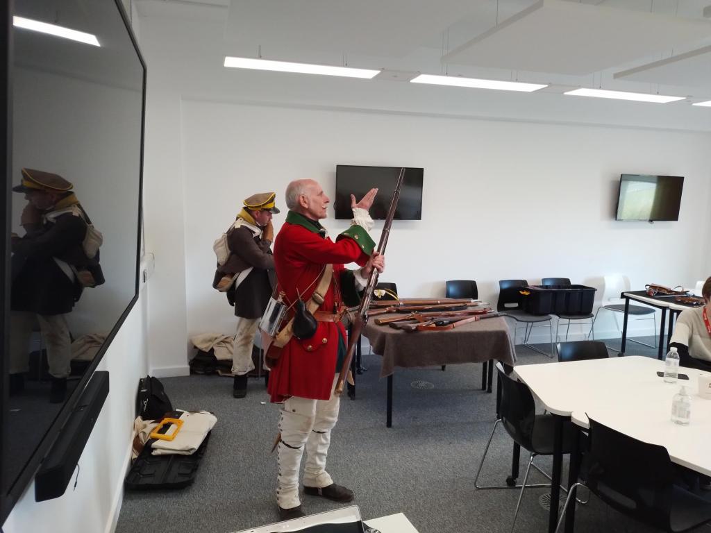 Andy Smith is a re-enactor, and offered to come to class to display his uniform and kit, and to demonstrate his muskets. He came along in the uniform of an Irish regiment in the French service from the mid-eighteenth century. He was accompanied by his colleague Richard, dressed in the uniform of a Prussian Landwehr regiment from the Napoleonic Wars.