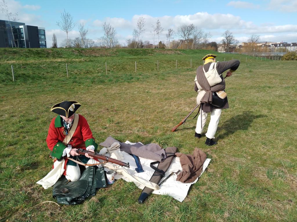 After the classroom demonstration we therefore moved outside to a grassy area on the outskirts of campus. The landscape was perfectly flat, just like the ideal eighteenth-century battlefield! Andy and Richard gave us a firing demonstration of a selection of the muskets and rifles, while the class stood a safe distance away, marshalled by the university Safety team.